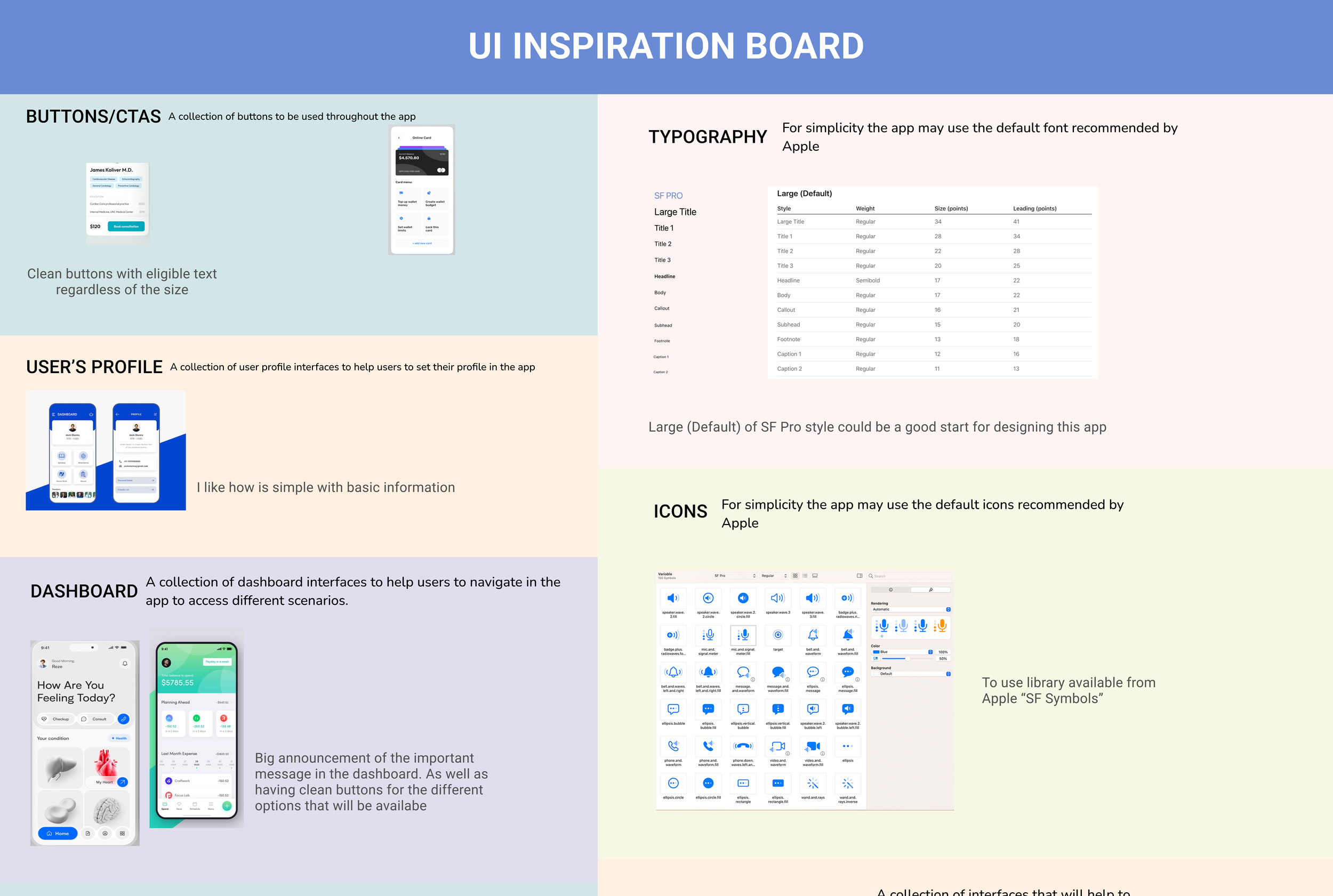 I designed using Figma an UI inspiration board that will provide me with inspiration for creating screen designs that include the features mentioned in the task flow.